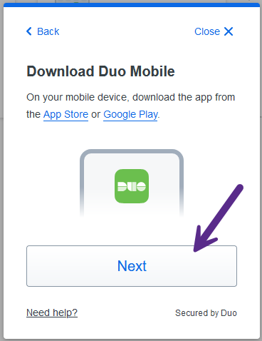 Download the Duo Mobile app on your Apple or Android smartphone. You can search for the app in your device's app store. The window also contains links to the app store page (Apple Store and Google Play) to help you identify the correct app. Click on the "Next" button to continue.