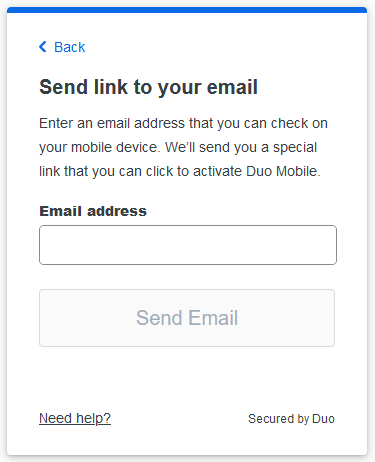 If you have trouble with the QR code, click the activation link instead. This will take you to a new window where you can enter an email address to which the activation code should be sent. Access the email from the same device where you have Duo Mobile installed.